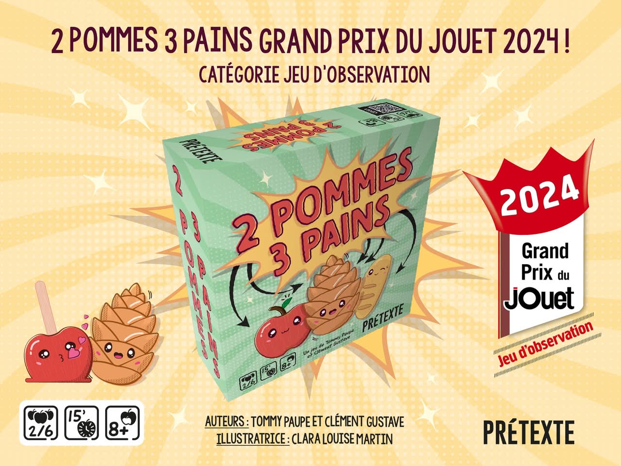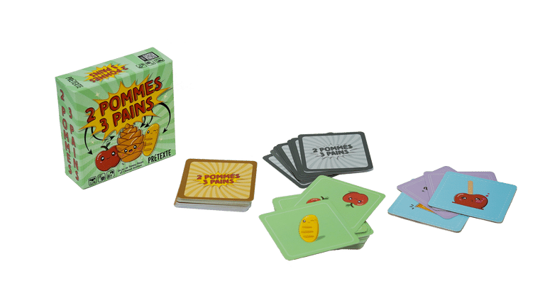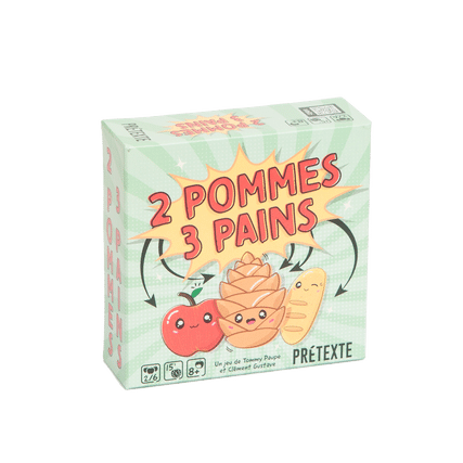 2 Pommes 3 Pains est un jeu d’annonce malin où les joueurs devront annoncer le nombre de Pommes et de Pains qu’ils voient. Mais attention à la Pomme de (deux) pins qui vient perturber la fête !